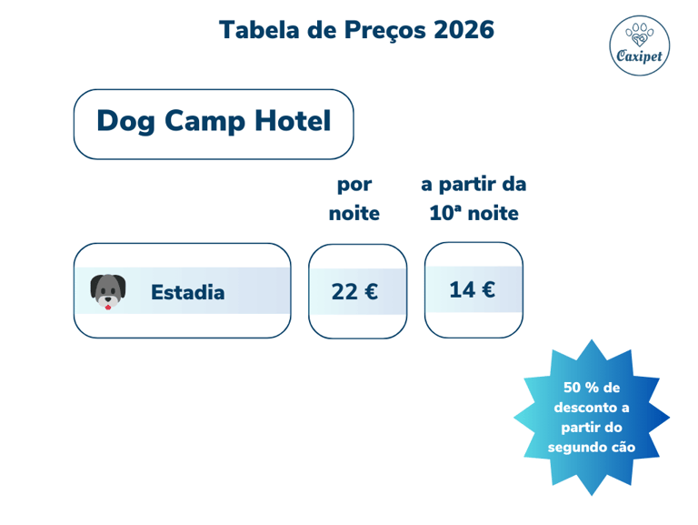 🕐 O horário de entrada no Dog Camp Hotel (check in) pode ser efetuada a partir das 7h30, sendo que a saída (check out) tem de ser efetuada até às 19h30